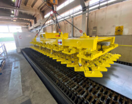 The rigid electro-permanent beams of the TREFIX-T series have been designed to load and unload sheet metals of specific dimensions onto cutting machines (laser, oxycutting, plasma). Once the sheet metal has been cut, the beam is able to unload it from the machine along with the chips with a single clamping operation, making the machine immediately available for the next sheet metal. The load is lifted from above without deformation or damage, and remains clamped indefinitely with a constant force, limiting the energy consumption to the magnetic activation or deactivationcycles. They do not require the installation of buffer batteries, feature an “anti-accidental deactivation” system, and offer as well the possibility of selecting the modules to be magnetized according to the size of the load. Thanks to the provided remote control, a single operator is able to carry out all the operations while remaining at a safe distance from the load.